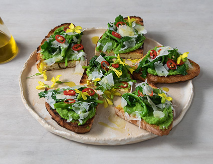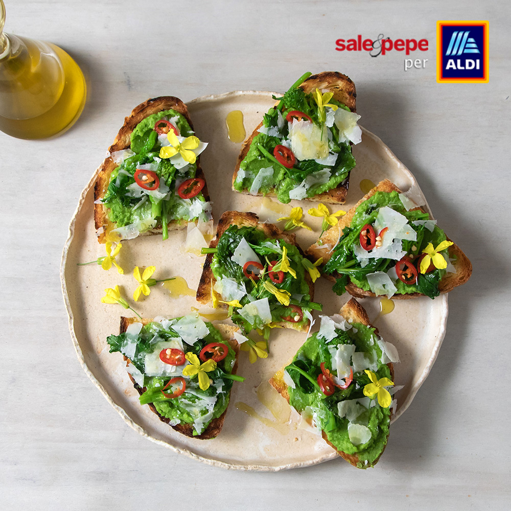 CROSTONI DI PANE CON CREMA DI PISELLI E CIME DI RAPA