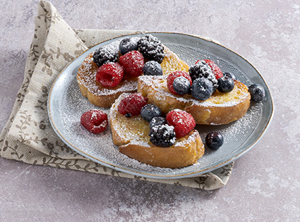 Servi 2 fette di french toast a testa, guarniti con frutti di bosco e spolverati di zucchero a velo.